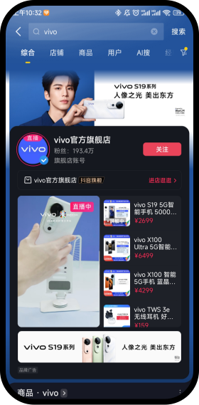 用户在抖音搜索,命中广告主品牌词后,首位展示品专信息,品牌视频自动播放。